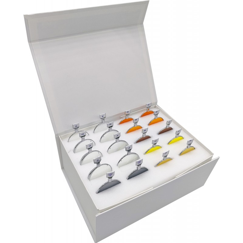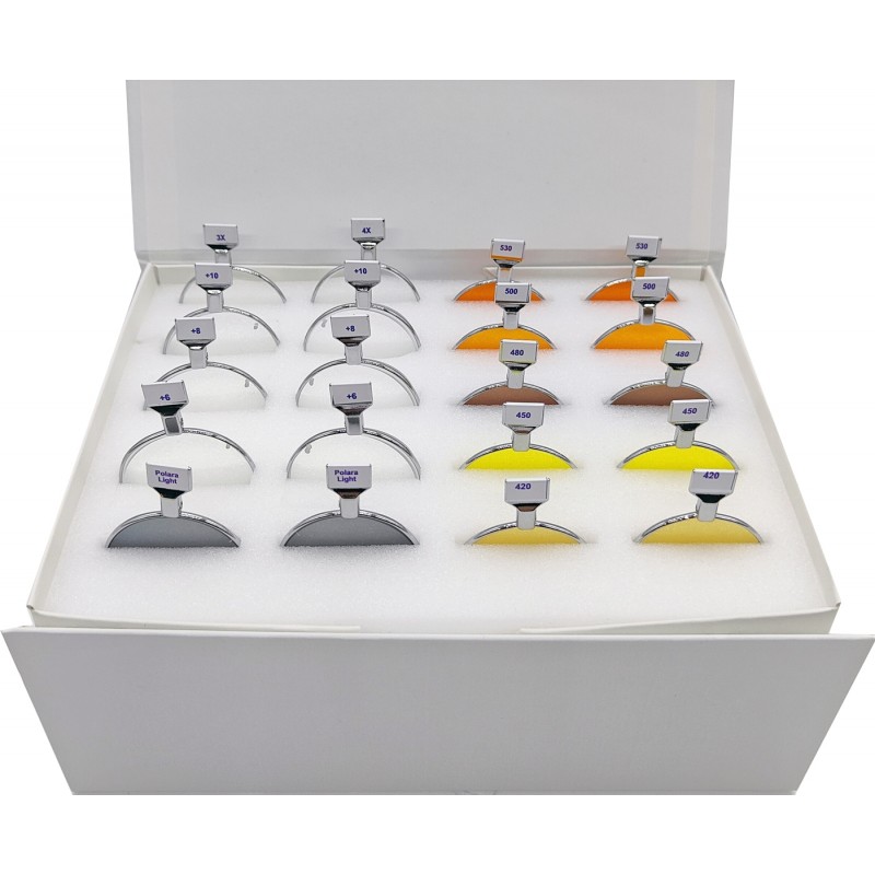 Il kit contiene • New SunBlocker (su oculus - 2 pezzi per tipologia) 420 - 450 - 480 - 500 - 530 • New SunBlocker POLARA (su oculus - 2 pezzi) POLARA LIGHT • Sistemi Microscopici IPER Aplanat (su oculus) Iper Aplanat 3X - Iper Aplanat 4X • Sistemi Microscopici IPER Bino (su oculus - 2 pezzi per tipologia) Iper Bino +600 / +800 / +1000 • n° 1 Flipper • Ottotipo - Low Vision Reading Chart |
